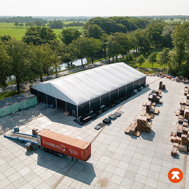 Dank der vollständigen Isolierung dieser kondensfreien Halle entsteht ein angenehmes Raumklima für Büro- oder Verkaufspersonal. Durch das professionelle Erscheinungsbild und den Komfort eines festen Gebäudes ist diese isolierte Zelthalle eine ideale (temporäre) Lösung während Umbauten oder nach Brandschäden am Firmengebäude.