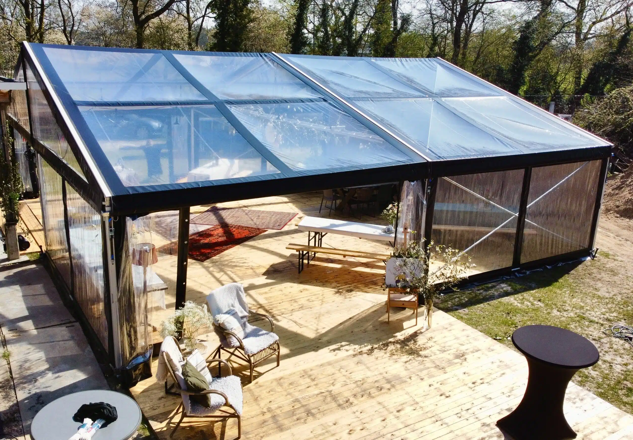 Les bâches transparentes offrent un aspect luxueux et lumineux, comparable à celui d’une serre. Disponibles en panneaux latéraux, toitures ou pour des structures entièrement transparentes.